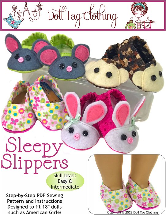The shape of these slippers are based on “Stokie” slippers. Stokies are toweled slippers that defy all rules of fashion yet they are very popular in South Africa and now come in a variety of designs to suit your personality. The slippers have a nice rounded toe piece and around the back of the foot is an elastic casing to keep the slippers on the doll’s foot.Sleepy Slippers is a very versatile pattern with options to suit every personality! You can create plain slippers with woven fabric and prints. Want to add some fun? Create a pair of critter slippers. Included are templates to sew a mouse, monkey or bunny.Included bonus — pattern and instructions to create a small bow.Boy doll? These are perfect for boy dolls to wear as well!Two assembly methods are included. Choose one that suits your style or crafting level:The soft sole is easy and also quick to sew and in under an hour you have a pair of slippers for your doll.The foam sole takes a bit more time and skill but you end up with a pair of authentic looking slippers with a firm sole.Pattern is designed for woven fabric.Designed to fit 18 inch dolls such as American Girl doll.You Will Need:• Soft Sole Slipper:Main Fabric — 5” x 14”Interfacing — Optional — 4” x 5”• Foam Sole Slipper:Main Fabric — 5” x 10”Craft Foam — 3.5” x 3.5”Cardstock — 3.5” x 6”• Critter Face – Felt — 2” x 6”• Bow — 3” x 8”• 1/4 Wide Buttons — x3 (eyes and nose)• 1/4" Wide Elastic — 8”• Glue or Glue gun