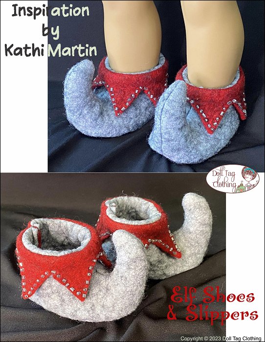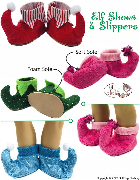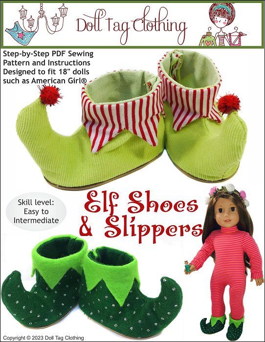 Inspired by medieval pointed shoes, elf shoes have evolved into the fantasy accessory that is a must have for fairies, pixies and elves.These shoes have the perfect point in the front that can be decorated with a bell or pom-pom. It is woven fabric and felt.Three cuff options are included in the pattern. You can sew a pointed cuff, add a felt cuff, add trim or sew slippers and add a ribbing cuff.To complete the shoes, two methods are included: 1. Soft Sole Slipper style — Completely sewn on the sewing machine2. Foam Sole — The top of the shoe is completed and then glued onto a foam base.This pattern fits 18 inch dolls such as American Girl®SUGGESTED FABRIC:- Pattern is designed for WOVEN fabric. A variety of fabric can be used.- Light weight corduroy, light weight denim, thin suede, cotton.- Felt, fun fur, velour.- Shoe Sole — 2mm Craft foam and Cardstock.