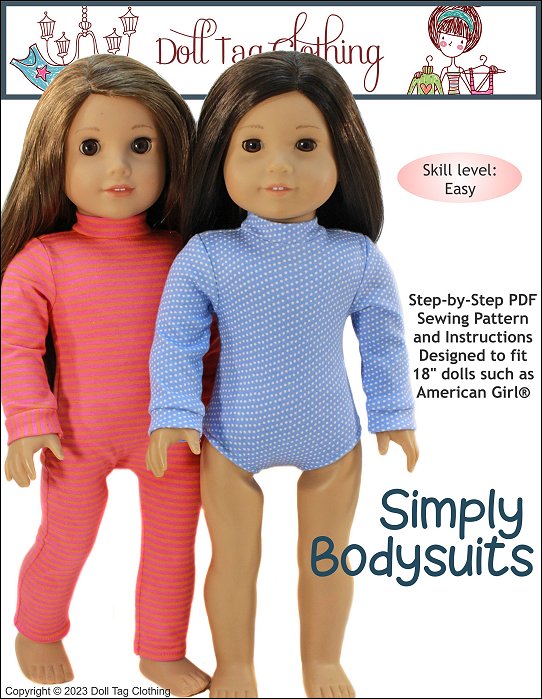 Bodysuits are so useful for mix and match doll play. It works great as an undergarment for skirts and pants or best of all... fantasy dress up outfits. This bodysuit also has a seamless front for embroidery or decoration.This pattern includes a bodysuit with long sleeves and cuffs. The neckline is finished with a high neckband. Two leg lengths are included, ankle and leotard length.Pattern is designed for knits or spandex.This pattern fits 18 inch dolls such as American GirlĀ®