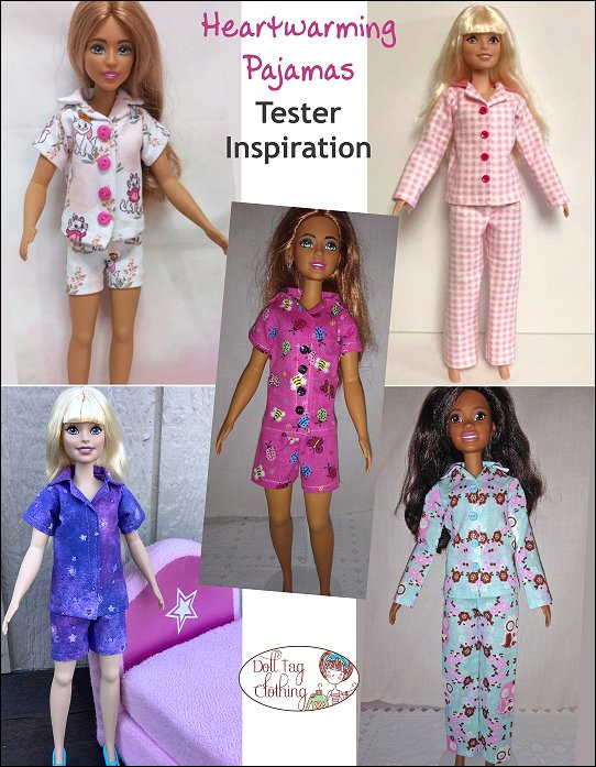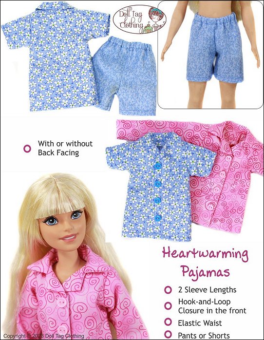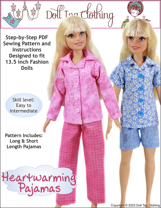 Traditional style pajamas to keep your doll warm and cozy. The jacket has a simple collar with hook-and-loop front closure for easier doll play. Snaps can also be used. The buttons make the pajamas look more authentic.The pants have an elastic waist.Use cotton woven fabric to make your pajamas. Included is a short sleeve with shorts option. ** Two options for the jacket are included. One with back facing and a simpler version without the facing.Doll Size:13.5 inch My First fashion dollsDOES NOT FIT Regular 11.5" Fashion dolls