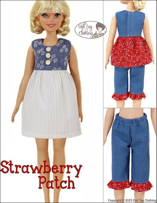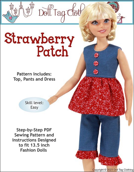 Create a sweet outfit for your doll to play in. Use different color and fabric combinations for playful looks and a bright Summer. The outfit includes a top with hook-and-loop closure in the back. The bodice is fully lined. The pants are three quarter length finished with a cute ruffle cuff.Dress length pattern also included.Doll Size:13.5 inch My First fashion dollsDOES NOT FIT Regular 11.5" Fashion dollsSupplies Needed:Main FabricContrasting FabricLiningHook-and-loop TapeElastic 1/4” Wide