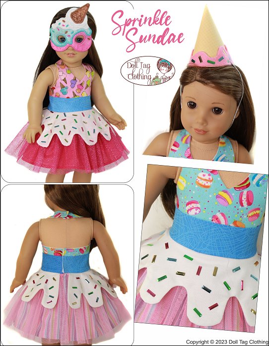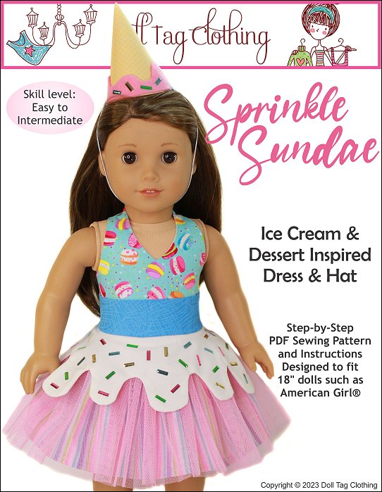 Brighten up your party with this fun and playful dress! This sweet dress has a pannier layered over the full tulle skirt, that looks like ice cream melting. Instructions are included for adding hot stick metals but you can add any gems or beads to look like sprinkles OR use fabric that looks like sprinkles!The skirt of the dress has three layers, lining, tulle and the pannier that come together at a neat broad waistband. The halter bodice is fully lined and closes with a snap at the back of the neck. The dress has a hook-and-loop closure.BONUS Printable Hat Included! Print, cut and stick a cone hat to match the dress.Doll Size: 18 inch dolls such as American Girl®.Recommended Fabrics: Bodice, Waistband, Skirt and Lining: Light to medium weight woven fabrics such as cotton, quilter’s cotton, linen, sheeting and similar. Skirt Overlay: FINE tulle or dance mesh. Melting Ice Cream Pannier — Lined: Medium weight woven fabric