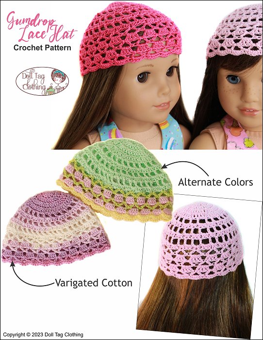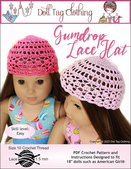 Crochet a delicate skull cap style hat for your doll to wear with a casual outfit or formal dress. Also the perfect accessory for your 70’s doll. This hat is crochet with a fine needle and cotton. It is easy to crochet in the rounds. Play around with variegated yarn or alternate colors for exciting variety. This PDF crochet pattern is designed to fit 18 inch dolls such as American Girl®.Supplies Needed:Lace Weight — Size 10 Crochet CottonHook: 1.5 mm (US 7)Yarn Hand Needle