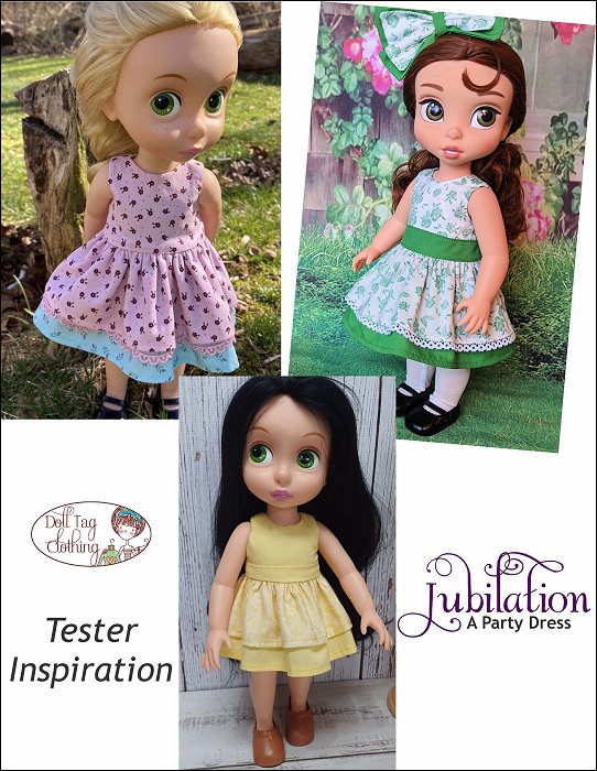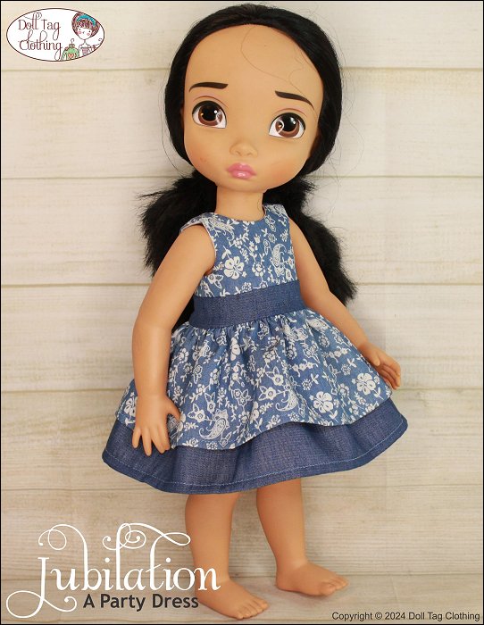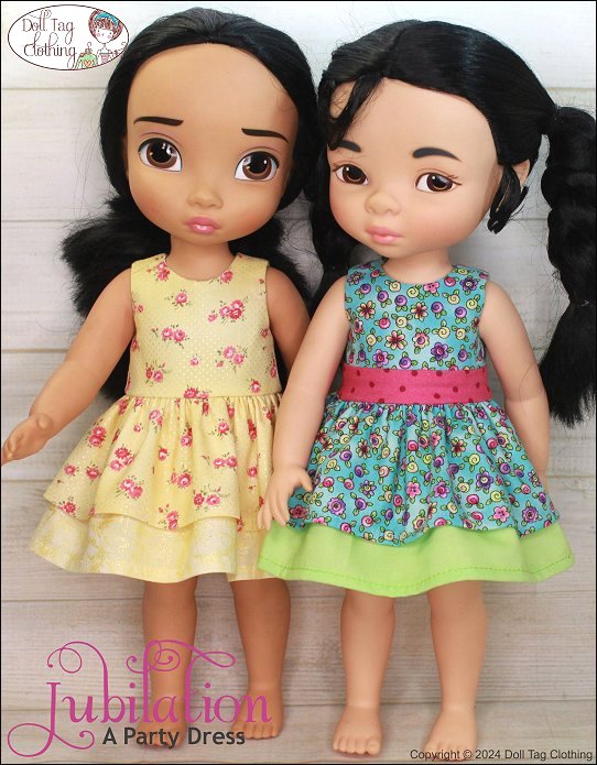 Fabulous and fun! A party needs a cute dress to wear. With this PDF sewing pattern you can sew a dress with two ruffle layers for your 16 inch doll. The dress has an option for you to add a waistband or to leave the bodice plain. The bodice is fully lined and the dress closes with hoop-and-loop tape in the back.Doll Size:16 inch Animator DollsMaterials:Light weight woven fabric like cotton or quilter's cotton.