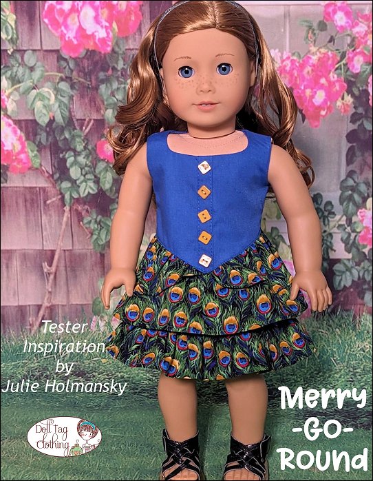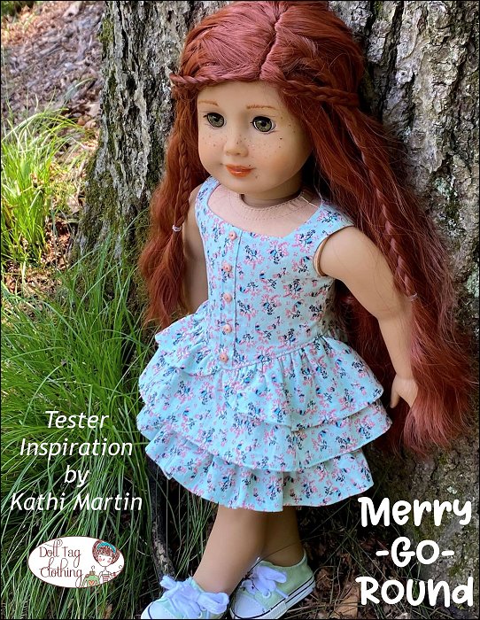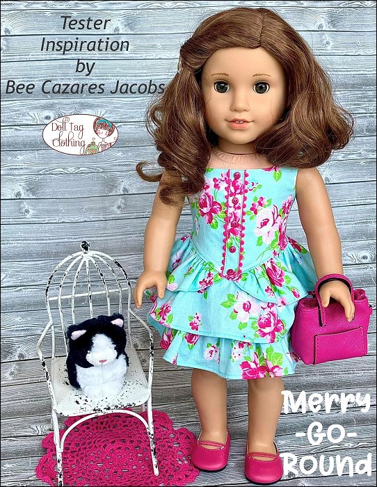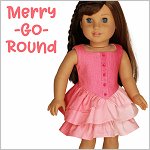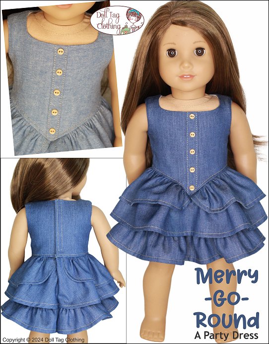 Playful party sleeveless dress with a basque front and faux button tab in the front. The dress is finished with three layers of ruffles. The top ruffle is in the shape of two panniers for a princess yet modern look.The dress closes with hook-and-loop in the back.Designed for medium weight woven cotton or light weight denim.Fits 18 inch dolls such as American Girl®You Will Need:- Fabric — 20" x 35"- Lining — 6.5" x 15"- Hook-and-Loop tape — 3.25"- 1/4" Wide Buttons — x5