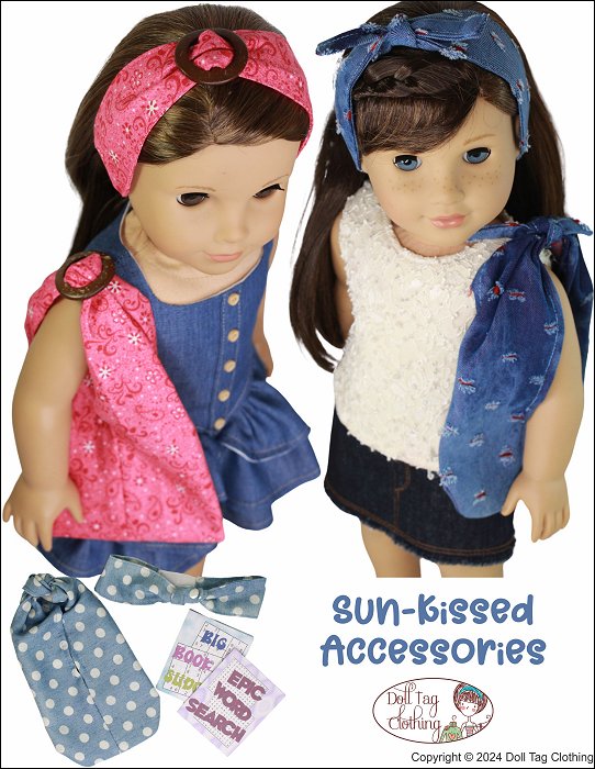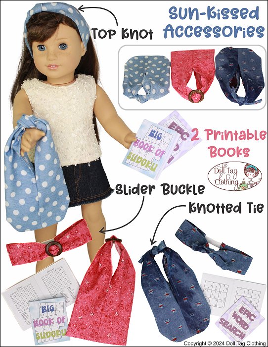 Accessories are wonderful for doll play! Sew a sling bag tote with a matching headband. The tote can be sewn with a rounded or straight bottom. The fun parts is… you can choose your band finish! There are three options included, tie a knot, slide a buckle or add a fabric tie.The tote is perfectly sized for the doll to carry over her shoulder. The headband closes with elastic so will not snag hair and can also fit a variety of hairstyles.Bonus Printables. You also get two books that you can print, fold and glue. Create Sudoko and Word Search for your doll to enjoy at the beach or pool.Fits 18 inch dolls such as American Girl®