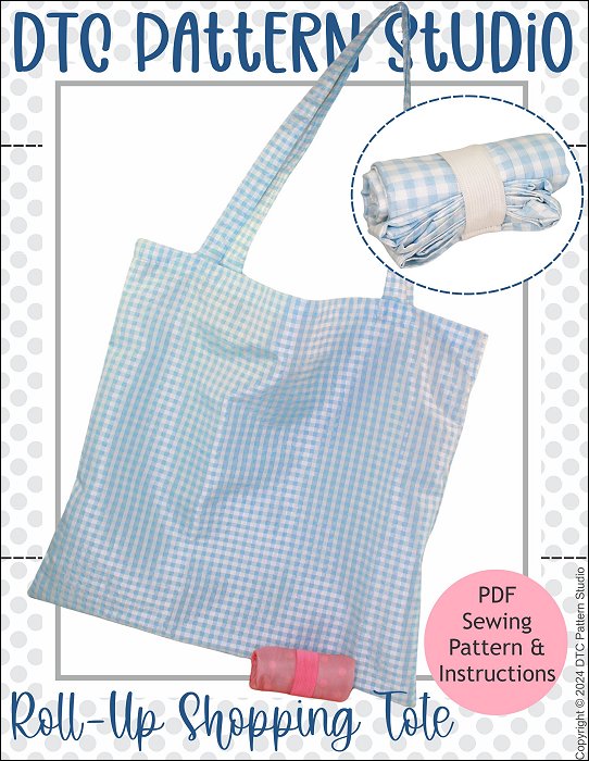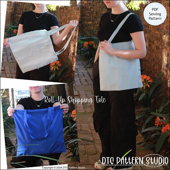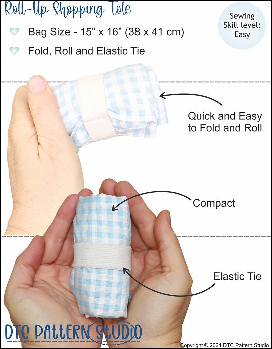 LIFE-SIZE PATTERNSew a fold and roll shopping tote that easily ties with an attached elastic.This is a step-by-step PDF sewing pattern and instructions to create a human size pattern.Complete Tote Size - 15" x 16" (38 x 41 cm)Instructions in imperial and metric measurements. Letter size and A4.Fabric Used• Light weight woven fabric• Woven synthetic, Parachute fabric, Nylon packing cloth, Polyester• Cotton, Quilting Cotton, Cotton blend