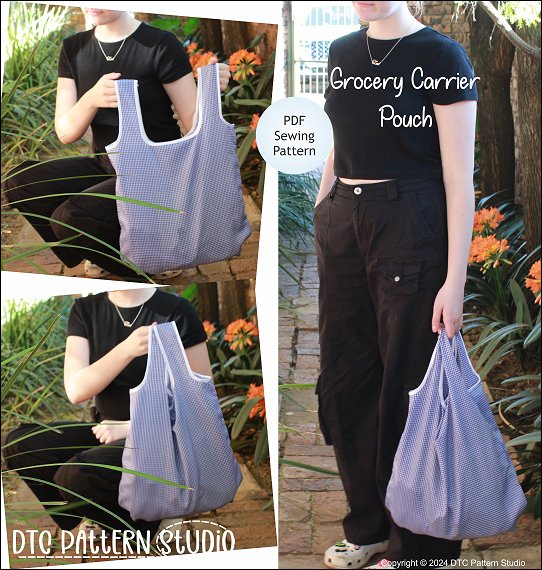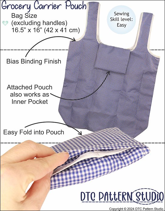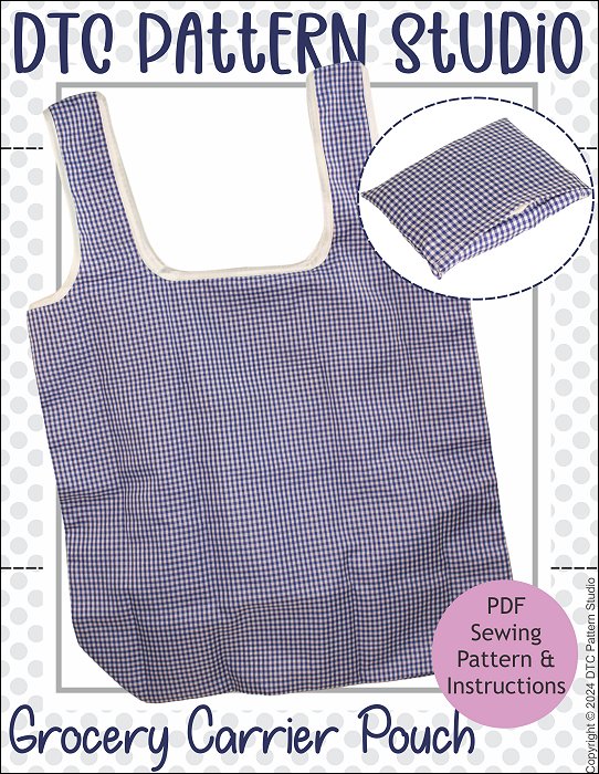 LIFE-SIZE PATTERNSew a grocery carrier bag that has a handy pocket attached. The bag neatly folds into the pocket creating a compact pouch for easy storage or carrying in your purse.The bag is made from light weight woven fabric with an attached pocket. The handles are finished with bias-binding.This is a step-by-step PDF sewing pattern and instructions to create a life-size pattern.Complete Bag Size (excluding handles) - 16" x 16.5" (41cm x 42cm)Instructions in imperial and metric measurements. Letter size and A4.Fabric Used• Light weight woven fabric• Woven synthetic, Parachute fabric, Nylon packing cloth, Polyester• Cotton, Quilting Cotton, Cotton blend• Bias-Binding