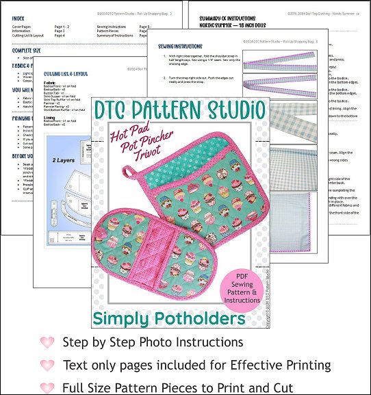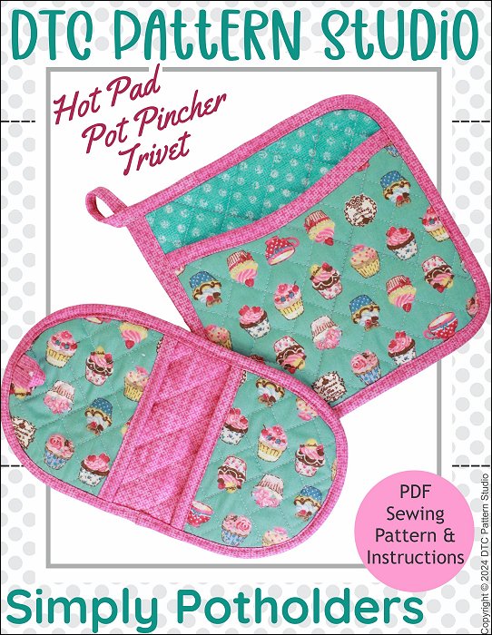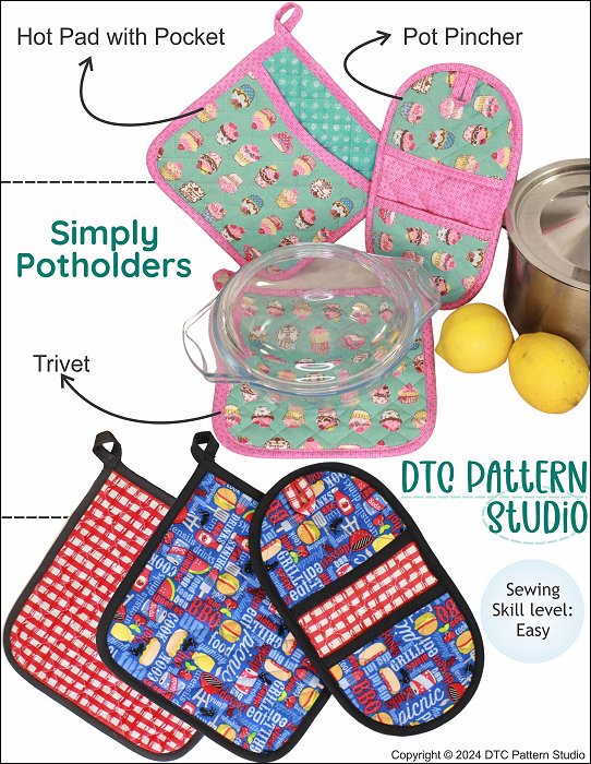 LIFE-SIZE PATTERNLearn to sew insulated potholders with this easy and also beginner PDF sewing pattern with Step-by-Step photo's.These potholders make great handmade gifts for newly weds, students and first time home owners. Any homemaker would love a new set of these!Pattern includes a pot pincher for use with ht plates, pots r bowls. The hot pad has a pocket to protect your hand during over use. The trivet is a pretty and practical way to protect your surfaces.Complete Size - Life Size - AdultsSkill Level - Easy / BeginnerInstructions in imperial and metric measurements. Letter size and A4.Fabric Used* Cotton, Quilting Cotton, Cotton blend* Insulating material such as cotton batting and terry cloth