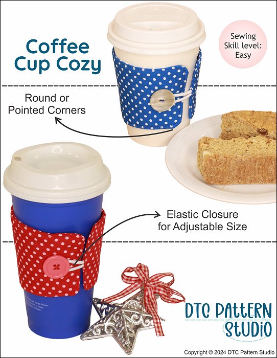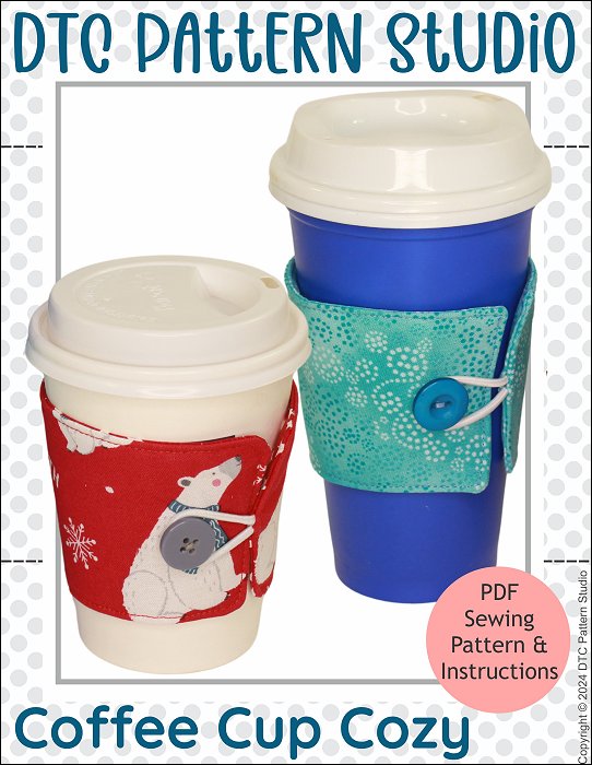 LIFE-SIZE PATTERNLearn to sew insulated coffee cup cozy with this easy and also beginner PDF sewing pattern with Step-by-Step photo's.These cozies make great handmade gifts for professionals, travelers and students. Any coffee person would love a new set of these!Pattern includes one size cozy with rounded or sharp corners. The elastic loops over a button which makes the cozy fit various cup sizes. You can also make the cozy reversible.The batting on the inside keeps the hands protected from the heat inside.Complete Size - Life Size - AdultsSkill Level - Easy / BeginnerInstructions in imperial and metric measurements. Letter size and A4.Fabric Used* Cotton, Quilting Cotton, Cotton blend* Insulating material such as cotton batting, batting or terry cloth