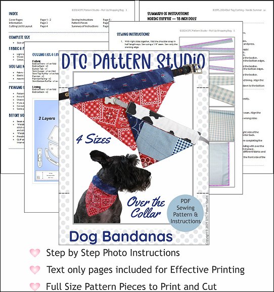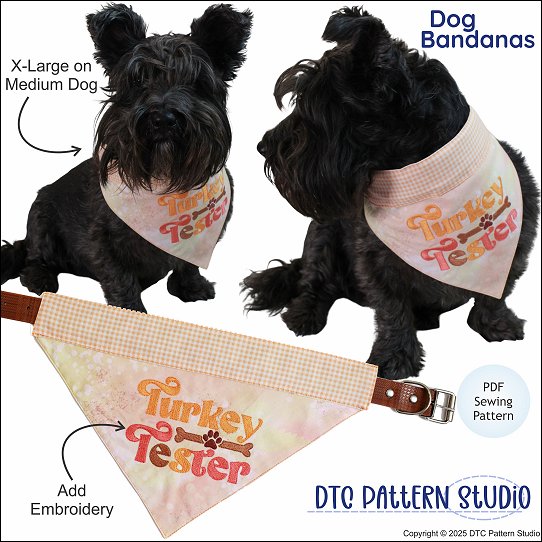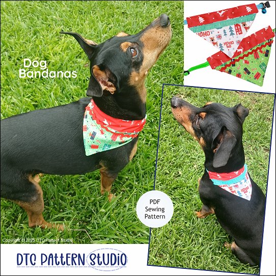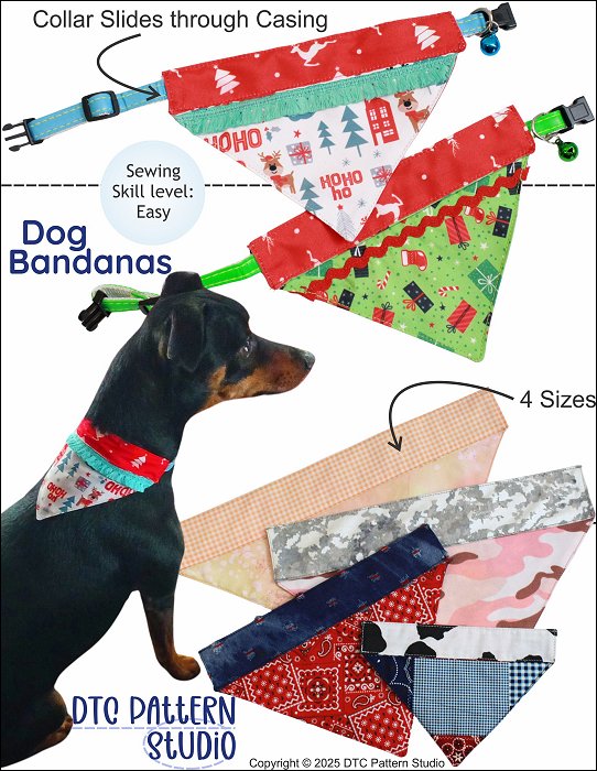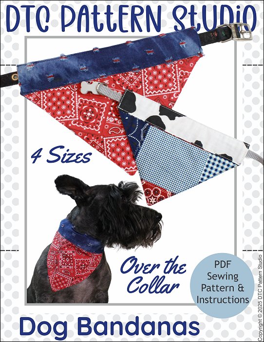 LIFE-SIZE PATTERNSew a delightful bandana for your favorite pet. Use different fabrics to match your mood, holiday or season. Included are also instructions to easily add an embroidery design.The bandana is lined with a fold over that creates a collar casing. The fold over adds flair by showing a contrasting fabric. Easily slide the dog collar of your choice through the casing to easily dress your dog.The fold over also adds durability to the bandana for longer use and slower wear and tear.