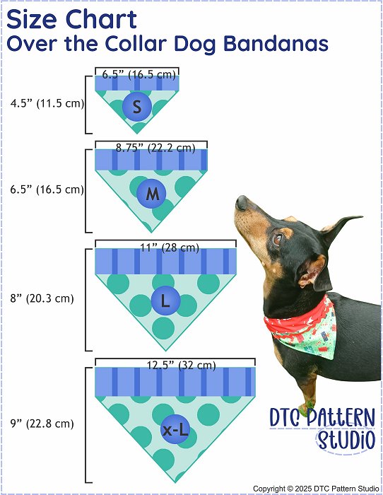 Fabric - Using this pattern you can use a variety of materials. Cotton and denim fabric are practical and durable.Handmade Gift - Personalize the bandana for a gift for a pet lover. Pattern Features:• 4 Dog Sizes - Small, Medium, Large and X-Large• Contrasting fabrics for a two tone bandana• Reversible• Sturdy Fabric: Use cotton or denim• Decorative Touches: Add embroidery, or fun prints to personalize• Trim: Add rick rack or trim for added flair