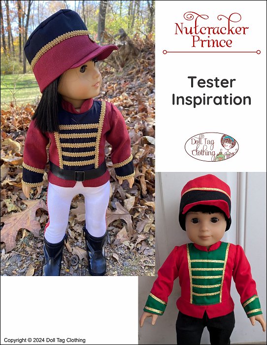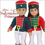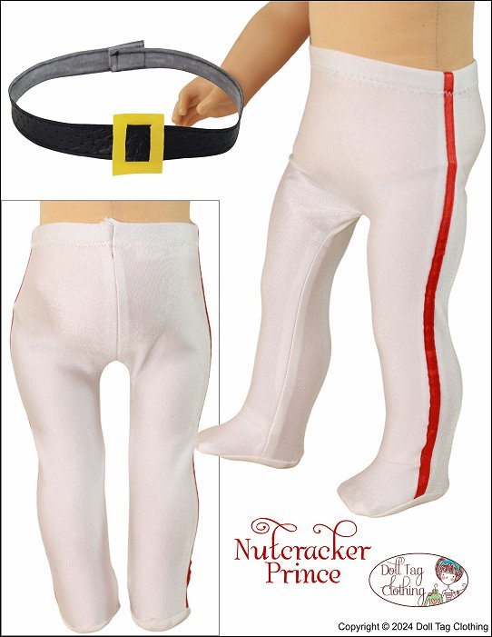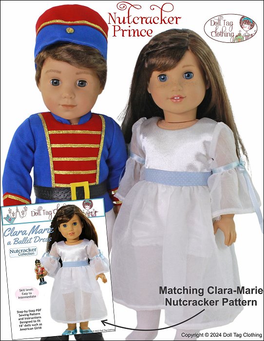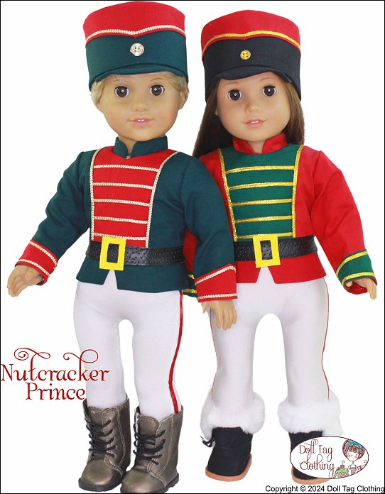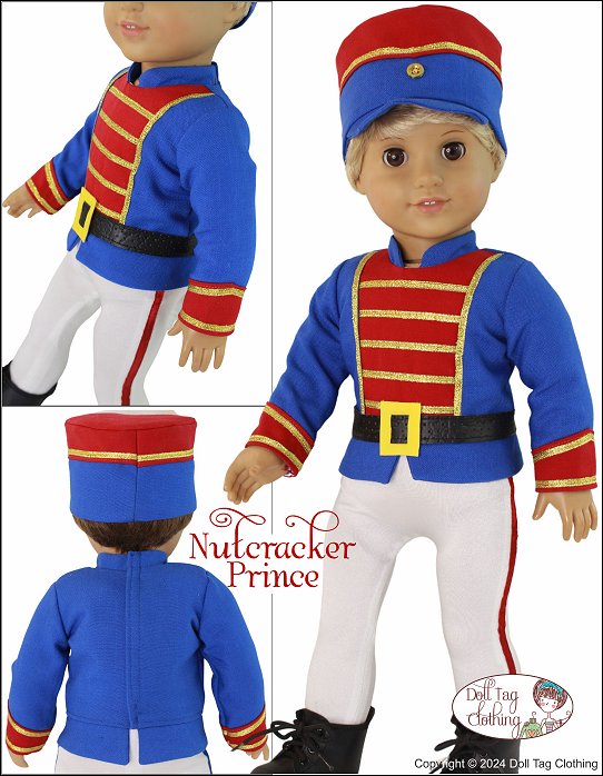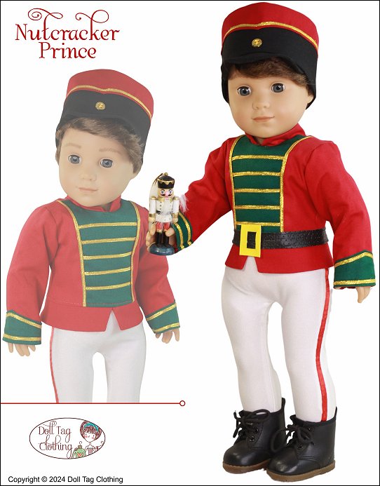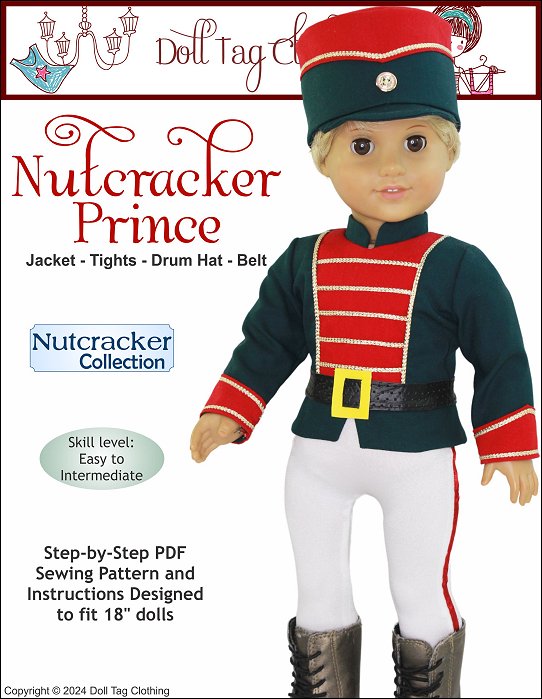 Sew the Nutcracker Prince from the Nutcracker Ballet for your boy or girl doll.This pattern includes a jacket with a contrasting insert, straight peplum and mandarin collar. Contrasting cuffs and trim adds details to this regal soldier. The jacket closes with hook-and-loop in the back.The tights are footed with an elastic waist and adorned with a ribbon stitched down the side. The drum shaped hat has a contrasting band and is finished with trim and a button detail. It comfortably fits on the doll’s head.Lastly the belt is easily made from vinyl and closes with hook-and-loop in the back.Pattern Includes:Nutcracker Jacket, Footed Tights, Drum Hat and BeltDesigned to fit soft body 18 inch dolls such as American Girl®