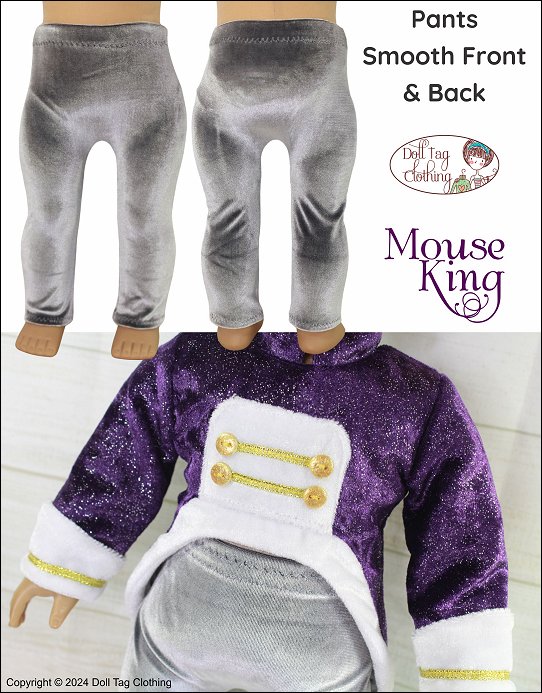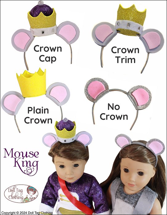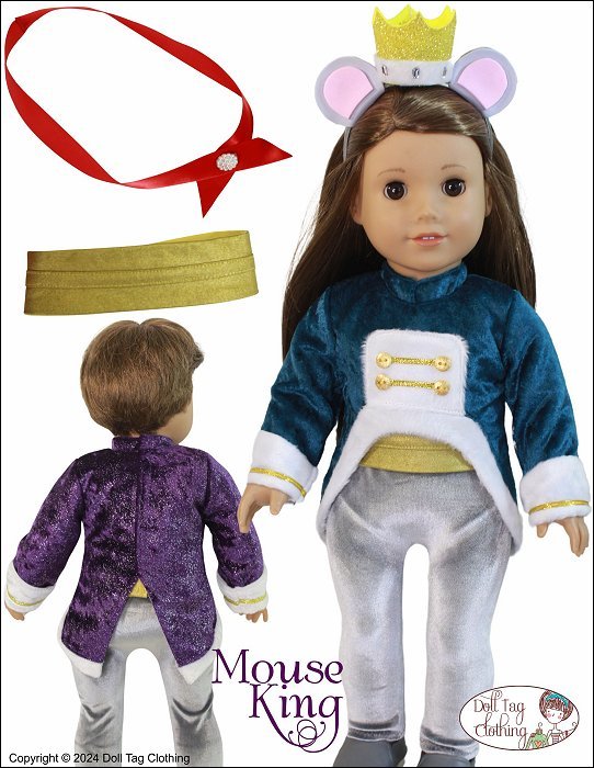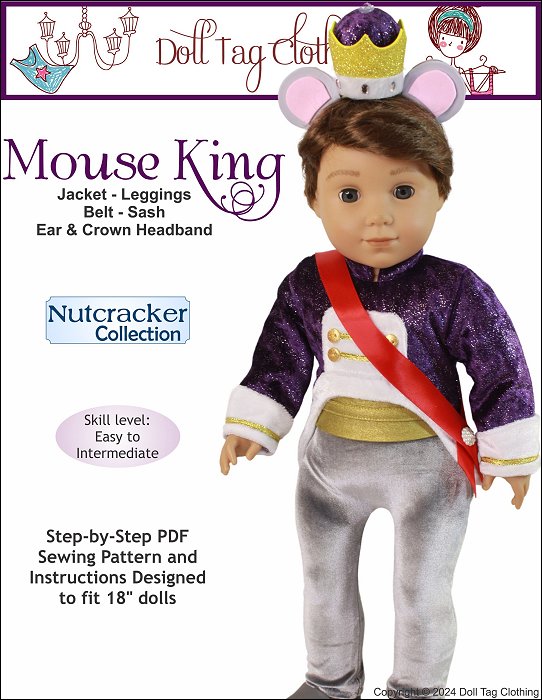 The Mouse King from The Nutcracker is a menacing, rodent ruler, dressed regally and commanding an army of mice in a battle against the Nutcracker.Sew and Create a Mouse King costume from the Nutcracker Ballet for your boy or girl doll.The jacket has a fur edge trim and cuffs. The jacket is short in the front with tails at the back. It closes with hook-and-loop. It has a pointed mandarin collar and the bodice is lined.The leggings have a smooth front and back with an elastic waist.The belt is lined with a hook and loop closure at the back.The ribbon sash uses a snap for closure.The mouse and crown headband is created from craft foam attached to a doll headband. The pattern includes instructions to make a headband from a coffee stirrer. Make a headband without the crown for the mouse army characters.Pattern Includes:Jacket, Leggings, Belt, Sash and HeadbandThis uniform is designed to fit soft body 18 inch dolls such as American GirlĀ®