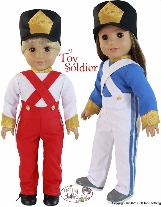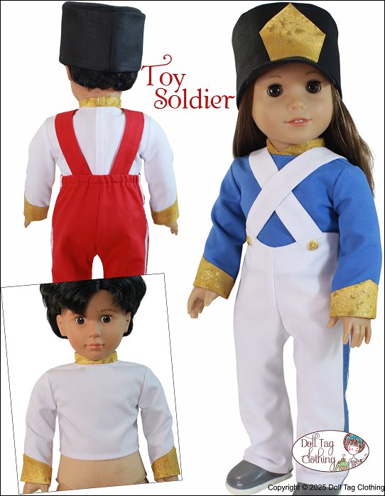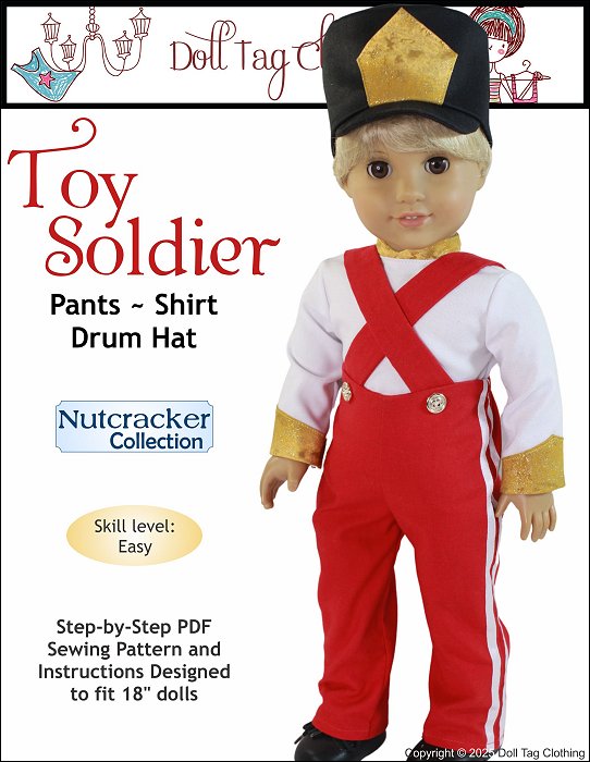 Another one of the favorite Nutcracker characters. Not just one but a whole cast of soldiers! Let your doll practice their traditional march in this classic Toy Soldier uniform. Spoken about in story books and an enduring theme at Christmas time, the wooden or tin soldier costume is sharp looking for dress up fun! For boy and girl dolls!This pattern can also be used for other Regal, Military or Civil War era uniforms. Also a reminder of the French foreign legion from the early 1900’s.Pattern Includes:Shirt, Pants and Drum HatPattern Features:SHIRT- Mandarin stand-up collar- Contrasting sewn on cuffs- Hook-and-loop closure in the backPANTS- High waist with elastic at the back- Cross Belts that join with snaps in the back- Ribbon sewn down the sidesDRUM HAT- Contrasting insert on the front- Comfortably fits on the doll’s headThis uniform is designed to fit soft body 18 inch Boy and Girl dolls such as American Girl®