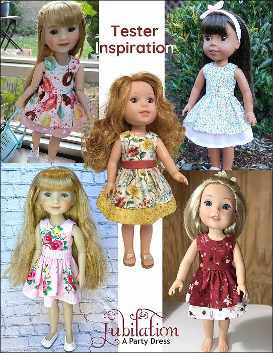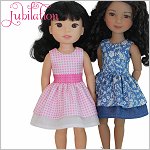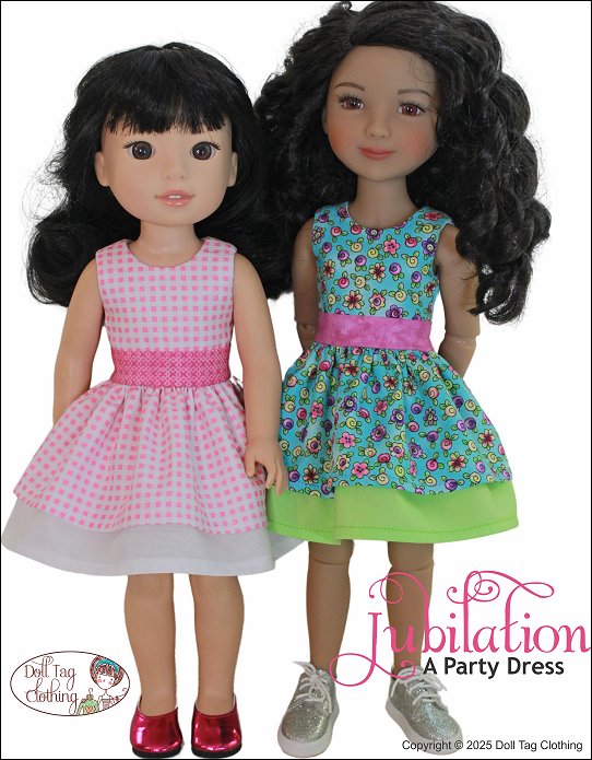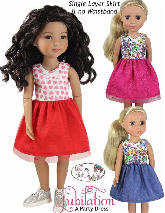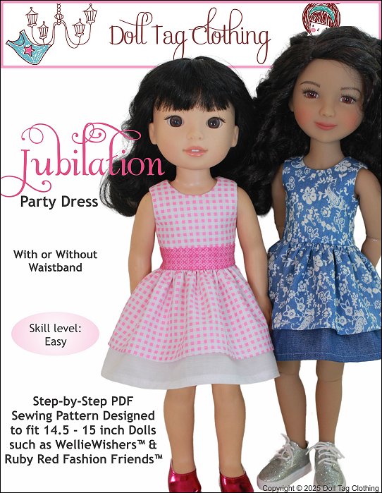 Fabulous and fun! A party needs a cute dress to wear. With this PDF sewing pattern you can sew a dress with two ruffle layers for your doll. The dress has an option for you to add a waistband or to leave the bodice plain. The bodice is fully lined and the dress closes with hoop-and-loop tape in the back.Doll Size:14.5 - 15 inch dolls such as WellieWishers and Ruby Red Fashion FriendsAlso fits - Melissa and Doug Mine to Love and Glitter Girls.Materials:Light weight woven fabric like cotton or quilter's cotton.