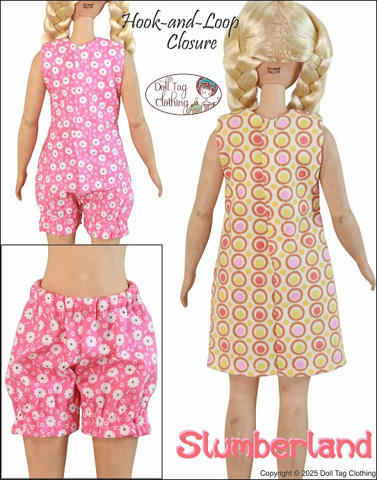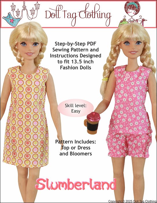 It's a warm summer evening and time to dress in some cozy pajamas and drift off to Slumberland. With this PDF pattern you can make a cute top with bloomers for bedtime. Also sew a summer slip dress.Features:- The bodice part of the top is lined.- Top closes with hook-and-loop in the back.- Dress length included.- Bloomers have elastic cuffs.- Adding lace to the bloomer hem is optional.Doll Size:13.5 inch My First fashion dollsDOES NOT FIT Regular 11.5" Fashion dolls