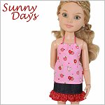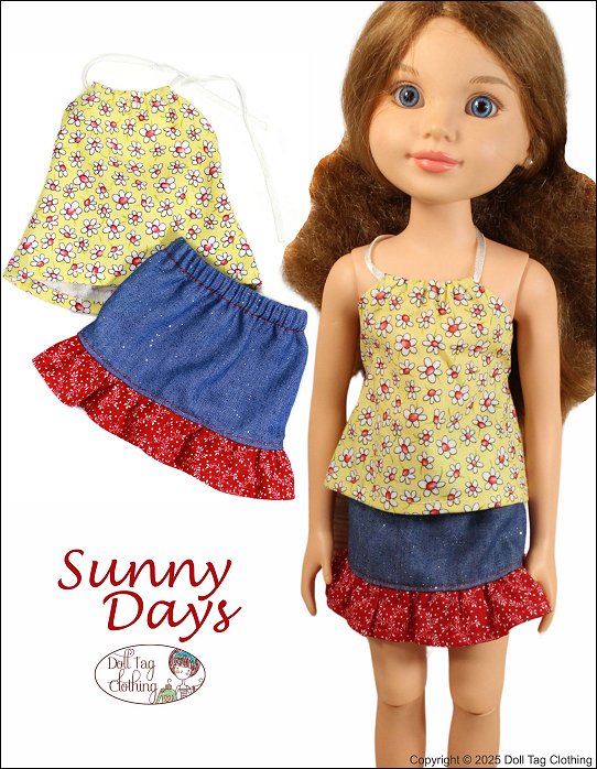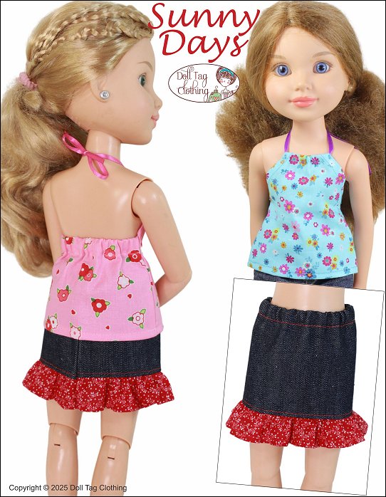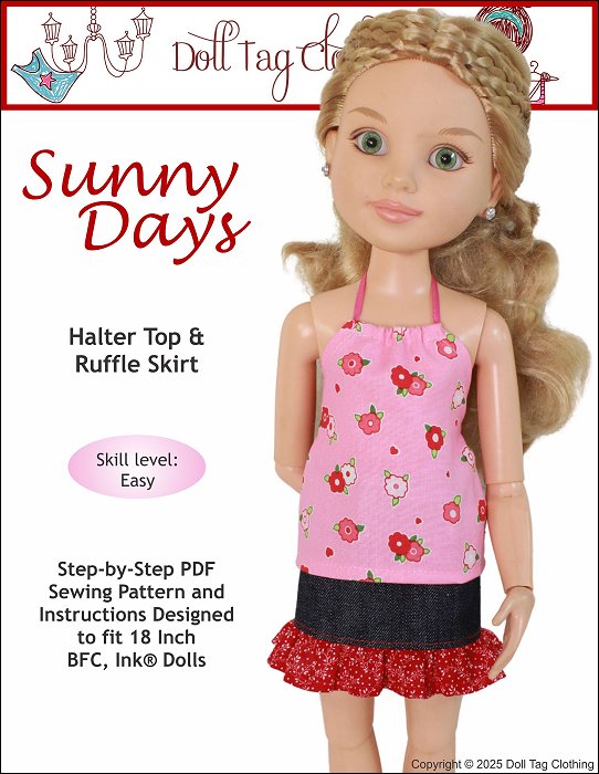 Sunny Days is quick and easy to sew. Create a fun summer outfit including a halter top with ribbon ties and ruffle skirt with an elastic waist.Doll Size:18 inch BFC, Ink dollFabric GuideSkirt — Medium weight woven fabric like cotton and quilt cotton.Top — Light weight woven fabric, cotton.