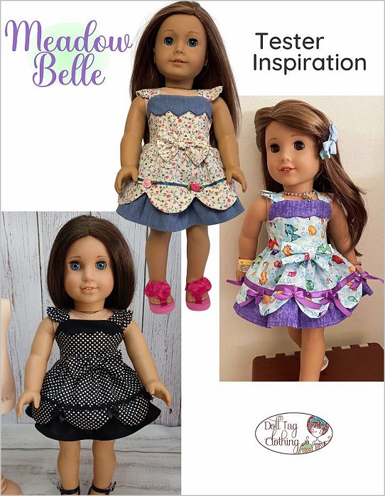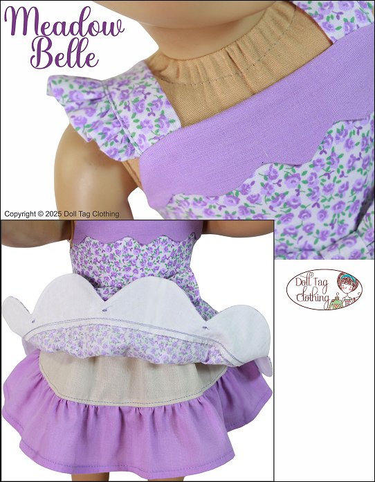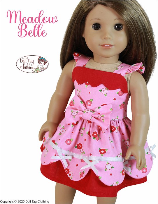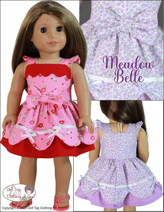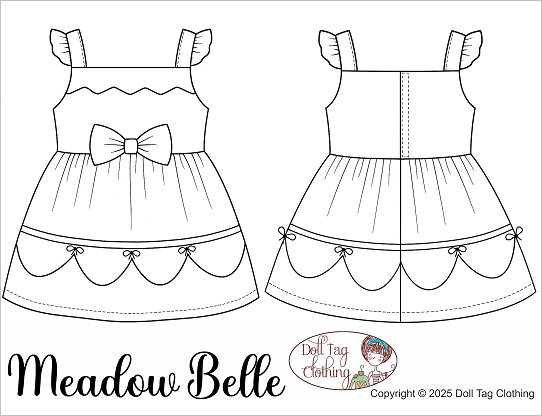 This darling sundress features a playful and feminine design in coordinating tones making it a perfect choice for spring or summer playtime or display. The bodice is fitted with wide shoulder straps adorned with small ruffles. The bodice gives a classic silhouette, while the gathered skirt brings fullness and movement. The top skirt is finished with a scallop edge that is lined for easy sewing. The bottom skirt has a gusset with a ruffle attached to add flair to the skirt. The skirt is embellished with ribbon and small ribbon bows. The front of the bodice is adorned with a large fabric bow. Pattern Features:- Flutter Sleeves- Scallop Bodice Overlay- Scallop Skirt edge- Underskirt with ruffle- Ornate Fabric Bow- Decorative satin ribbon bows- Hook-and-Loop ClosureDesigned to fit soft body 18 inch Dolls such as American Girl