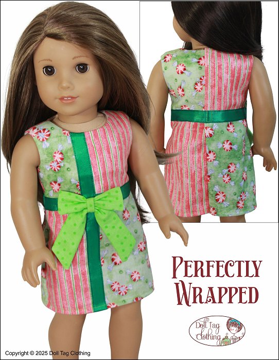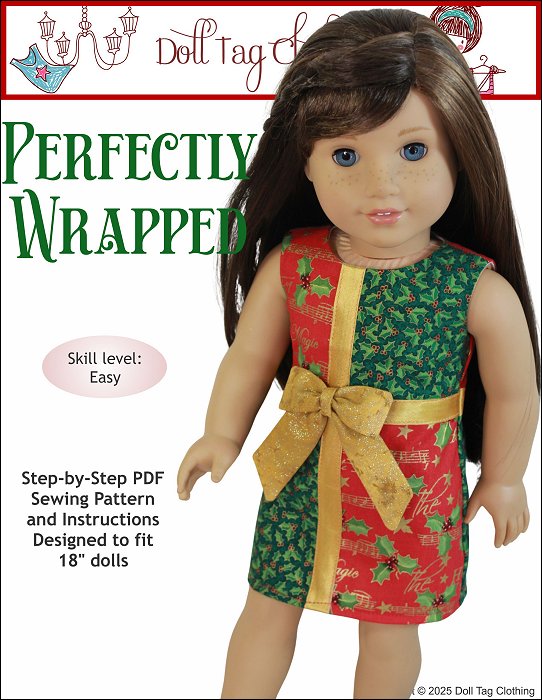 A fun and playful dress that is quick and easy to sew. I love to use this pattern for different prints of fabric to showcase the print. Perfect scrap buster too! Make any fabric look like a gift dress for your doll. The added bow make her totally Present-able! A real gift!The bodice is lined and the closure in the back is hook-and-loop but you can also add snaps.Doll Size: 18 inch dolls such as SA Girl Doll, Our Generation or American Girl