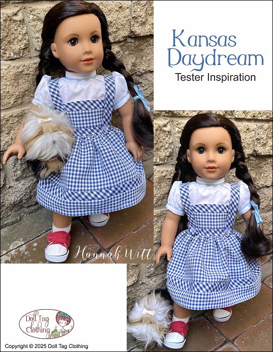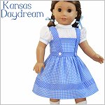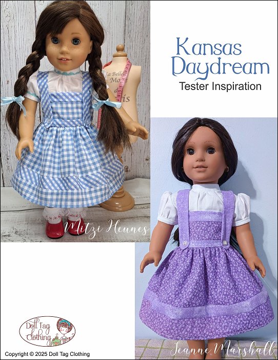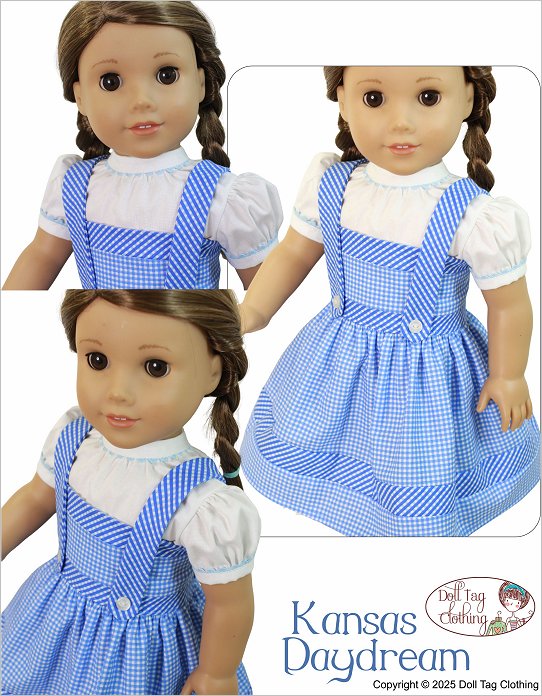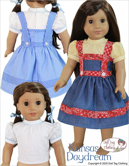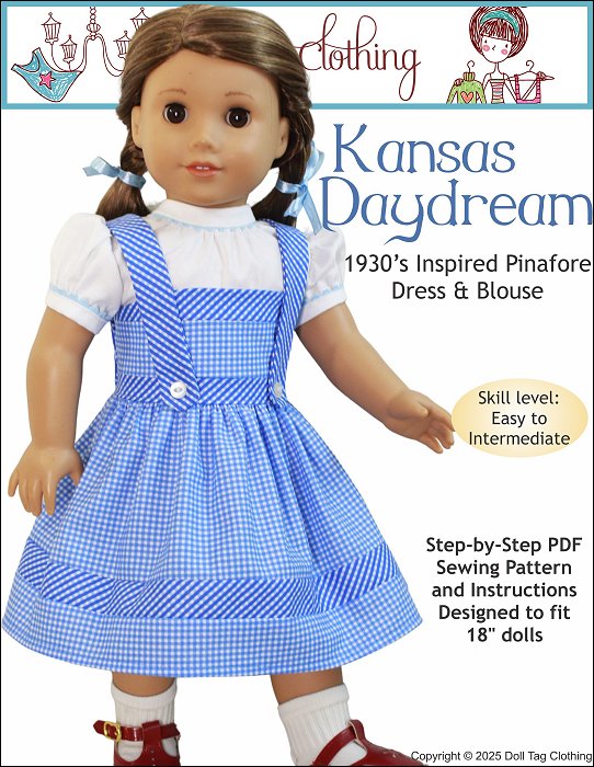 A 1930’s inspired pinafore style dress. The bodice is sewn with two contrasting bands and waistband. The full gathered skirt also has a contrasting band for added charm. The dress is sleeveless with shoulder straps attached to the waistband at the front and back. The dress hangs below the knee.Underneath the pinafore is a delightful high neck blouse with puffy sleeves. Inserted into the seams of the collar as well as the sleeve cuffs is rick rack for perfect detail.This dress can be used to create a 1930’s back to school ensemble or a modern day cowgirl. It will also work to create Dorothy’s magical costume from the land of Oz.Pattern Features:Pinafore• Lined Bodice• Contrasting strips• Decorative buttons added to the base of the shoulder straps• Full Gathered Skirt• Hook-and-loop closure at the backBlouse• High neck collar• Rick Rack detail in the neckline and sleeve cuffs• Puffy sleeves with cuff• Gathers at the neckline• Hook-and-loop closure at the backDesigned to fit soft body 18 inch Dolls such as American Girl