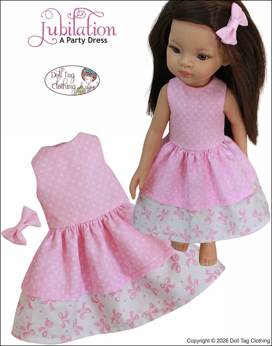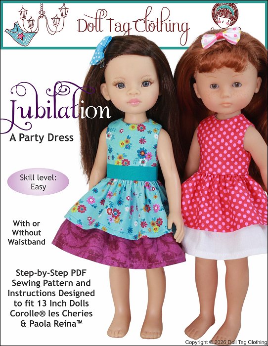 Fabulous and fun! A party needs a cute dress to wear. With this PDF sewing pattern you can sew a dress with two ruffle layers for your doll. The dress has an option for you to add a waistband or to leave the bodice plain. The bodice is fully lined and the dress closes with hoop-and-loop tape in the back.Doll Size:13 inch Paola Reina las Amigas and Corolle les Cheries DollsMaterials:Light weight woven fabric like cotton or quilter's cotton.
