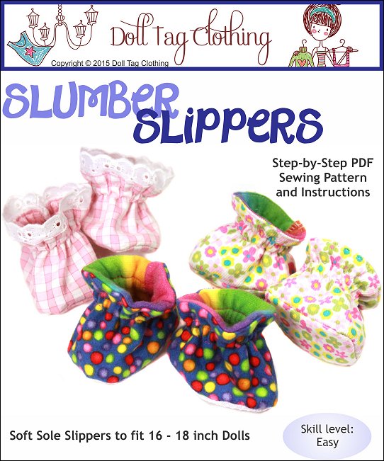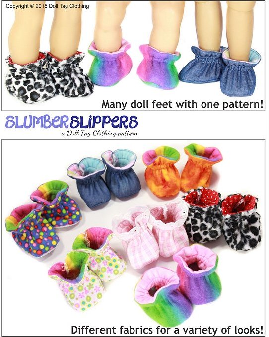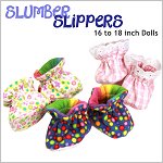Slumber Slippers are quick and easy to make and the perfect foot wear to go with summer or winter pajamas. The slippers are soft sole with elastic around the ankle.Doll Size: These slippers fit 16 to 18" dolls - the fit was tested and confirmed on the following dolls:- American Girl Doll- Bitty Baby- Dollfriends by Via-E- Karito Kid- Kidz 'n Cats- Magic Attic Club / CarpatinaMaterials:Woven fabric. Light weight corduroy. Fleece. Flannel.More Sizes:Slumber Slippers for 13 to 16 inch Dolls - CLICK HERE