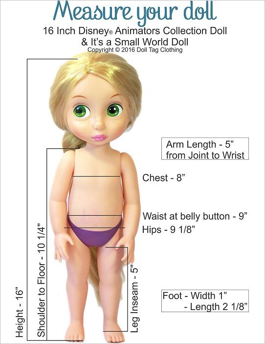Measurement Charts for:- 16 inch Animator Dolls---------------------------* The Animators are the same size as the now discontinued "It's a Small World Dolls".* Because of their unique body shape with the tummy, you need to buy patterns especially designed for them.---------------------------Doll Tag Clothing is not affiliated with the above mentioned dolls. No endorsement is implied.