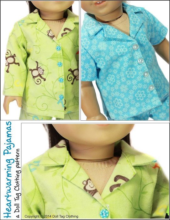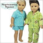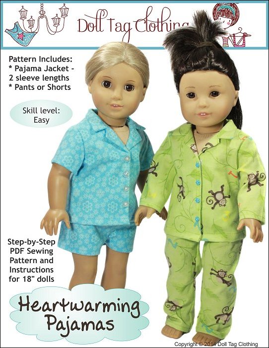 Winters are cold and the perfect pajamas are a set of flannels! Sew warm and cozy pajamas with this pattern. The top closes with hook-and-loop in the front and buttons sewn on the top. The pants have an elastic waist.Included is short and long sleeves and pants for winter or summer! These are also perfect to make for boy dolls.Doll Size: 18 inch dolls like SA Girl Doll, Our Generation or American GirlMaterials: The pajamas can be made from cotton flannelYou Will Also Need:• Pajamas - Flannel - 13" x 1yd• Hook and Loop - 3"• 3/8" Wide Elastic - 10.5"• 4 Small buttons - 1/4"