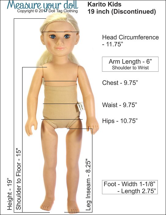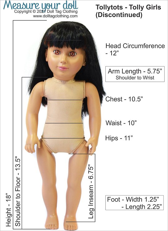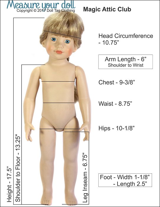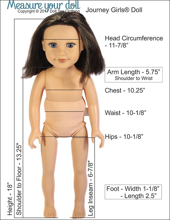Measurement Charts for:- BFC Ink- Journey Girls- Karito Kids- Magic Attic Club- Tollytots---------------------------* 18 inch Slim Girl Dolls. These dolls are slimmer/thinner than the traditional soft body 18 inch dolls such as American Girl.* 18” Dolls with Vinyl, soft or vinyl torso bodies. These are girl dolls (not baby or toddler dolls).* Some of these dolls can share clothes but many of them are unique in their proportions and measurements and you will need to buy patterns and clothes especially designed for them.---------------------------Doll Tag Clothing is not affiliated with any of the dolls mentioned on this page. These measurement charts are to be used as a reference only. No endorsement is implied.