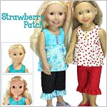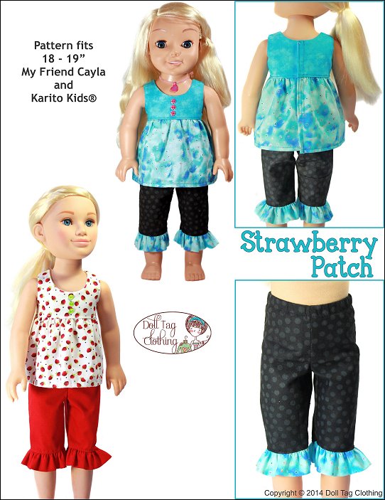 Go strawberry picking in this fun outfit! Play around with different color fabrics and prints for a bright summer. The outfit includes a top with hook-and-loop closure in the back and 3/4" pants with a cute ruffle cuff. This PDF pattern is designed to fit dolls.Doll Size: Karito Kids®, Dollfriends® by Via-E and My Friend CaylaMaterials: Light to medium weight woven fabrics. Quilt cotton. Shirting.You Will Need:-Fabric for Top – 9” x 17”-Fabric for Pants – 9” x 29” (or Fat Quarter)-Lining – 5” x 12” Remnant-4” Hook and Loop-8 ½” narrow Elastic for pants
