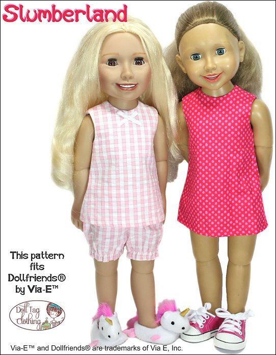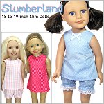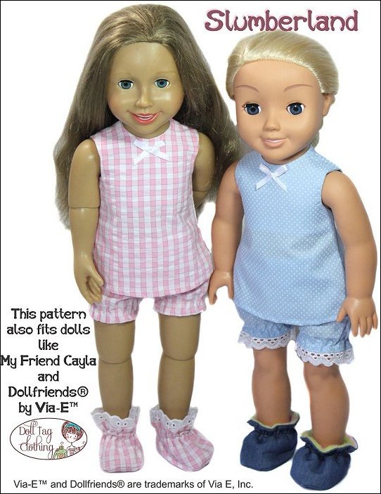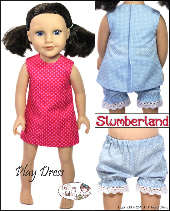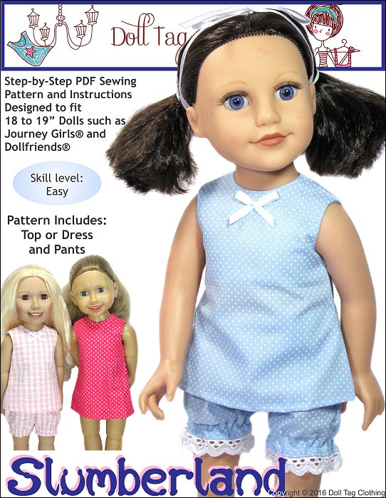 Sew cute pajamas for your doll with this pattern. The pattern includes an A-line top with a hook-and-loop closure in the back. The bloomer shorts have elastic cuffs and you can add lace or leave it off.Pattern pieces have been added for you to sew a simple A-line, knee length dress.Doll Size: 18 to 19 inch slimmer dolls such as Journey Girls, My Friend Cayla and Dollfriends by Via-EMaterials: Light to medium weight woven fabrics like quilt cotton, cotton and shirting. Flannel also works well.